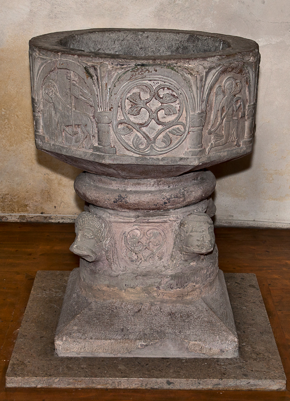 Dopfunten av sandsten med åttkantig reliefprydd cuppa har tillskrivits 1100-talets andra hälft av stenmästaren "Byzantios".