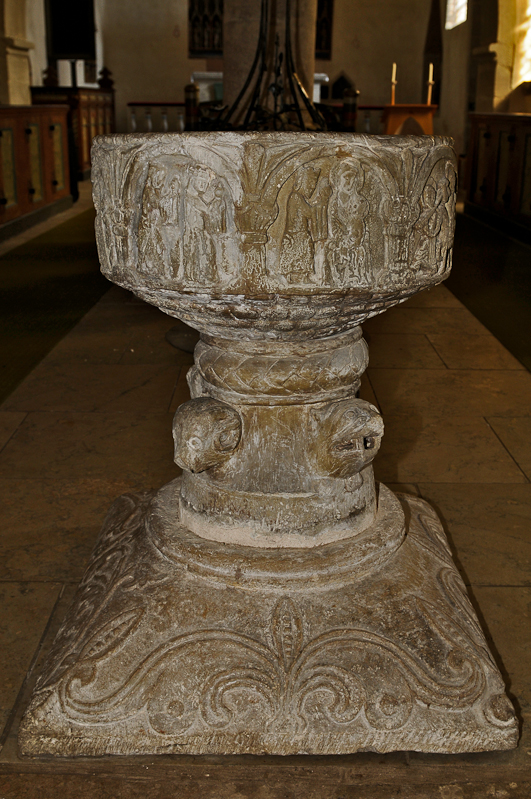 Dopfunt av sandsten från 1100-tals kyrkan med bilder ur Jesu barndom utförd av anonymmästaren Semi-Byzantios.